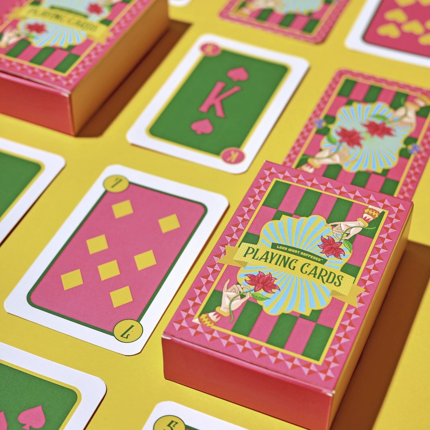 Designed with vibrant dopamine colors and playful patterns, these cards feature striking lotuses and a retro-inspired aesthetic that brings a modern twist to the traditional deck. Perfect for your Diwali card parties, this set adds a splash of fun and elegance to every game.